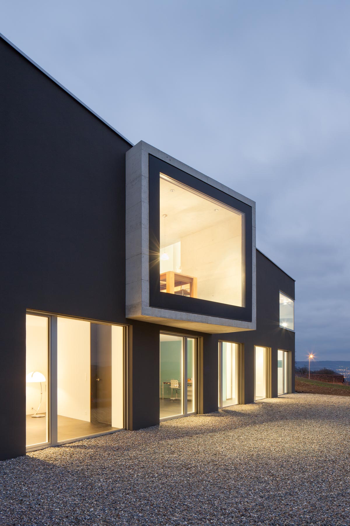 Breit wie ein Scheunentor und damit passend zur ländlichen Umgebung öffnet sich das moderne Familienhaus am Bözberg im Kanton Aargau. Der unerwartete Durchblick in die Ferne, aber auch die dunkle Fassade, die schwarz beschieferten Dachbahnen und die Proportionen des Hauses signalisieren, dass hier in einem ganz normalen Wohngebiet ein Stück aussergewöhnliche Architektur geschaffen wurde. Das Grundstück mit komfortablen 1200 Quadratmetern ist trapezförmig und öffnet sich am Hang wie ein Fächer nach unten. Dazwischen entfaltet sich der Aussenbereich. Das verbindende Element von Haus Nord zu Haus Süd ist der drei Meter breiter Korridor. Wie ein Vierkant schiebt sich das Sichtbetonelement durch die Bauwerke, trennt den Innenhof in zwei Teile und wirkt als Windschutz für den nach Osten liegenden Freiplatz mit dem zwölf Meter langen Pool.